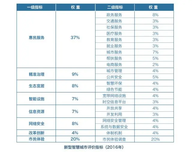 在筆者看來(lái),這一指標(biāo)體系首次將“存在感”提升到了最高的地位,為什么這么說(shuō)呢?因?yàn)殡m然從內(nèi)容上看該評(píng)價(jià)指標(biāo)體系包括惠民服務(wù)、精準(zhǔn)治理、生態(tài)宜居、產(chǎn)業(yè)經(jīng)濟(jì)、基礎(chǔ)設(shè)施、網(wǎng)絡(luò)安全、體制機(jī)制創(chuàng)新、市民體驗(yàn)等一級(jí)指標(biāo)和若干個(gè)二級(jí)指標(biāo),但其中惠民服務(wù)占比37%,市民體驗(yàn)占比20%,兩者權(quán)重超過(guò)50%,惠民服務(wù)和市民體驗(yàn)不正是“存在感”的最好體現(xiàn)。而智能設(shè)施、網(wǎng)絡(luò)安全等需要進(jìn)行大規(guī)模硬件投入的領(lǐng)域所占的權(quán)重并不高,這也是對(duì)《國(guó)家智慧城市試點(diǎn)2015年度工作報(bào)告》所提到的 “重硬件投入而輕市民參與”問(wèn)題最好的回應(yīng)。
